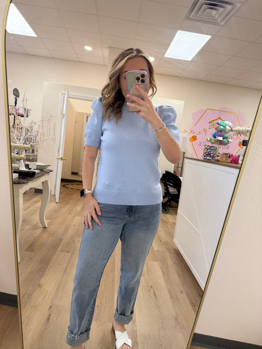 S+S SHORT PUFF SLEEVE WASHED DENIM BLOUSE TOP WITH FRONT BOW TIE